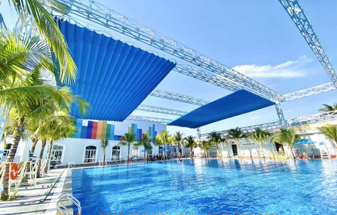 – Lắp đặt mái xếp lượn sóng che hồ bơi có thể điều chỉnh tùy ý và được thiết kế có bánh xe chạy trên đường ray sắt.