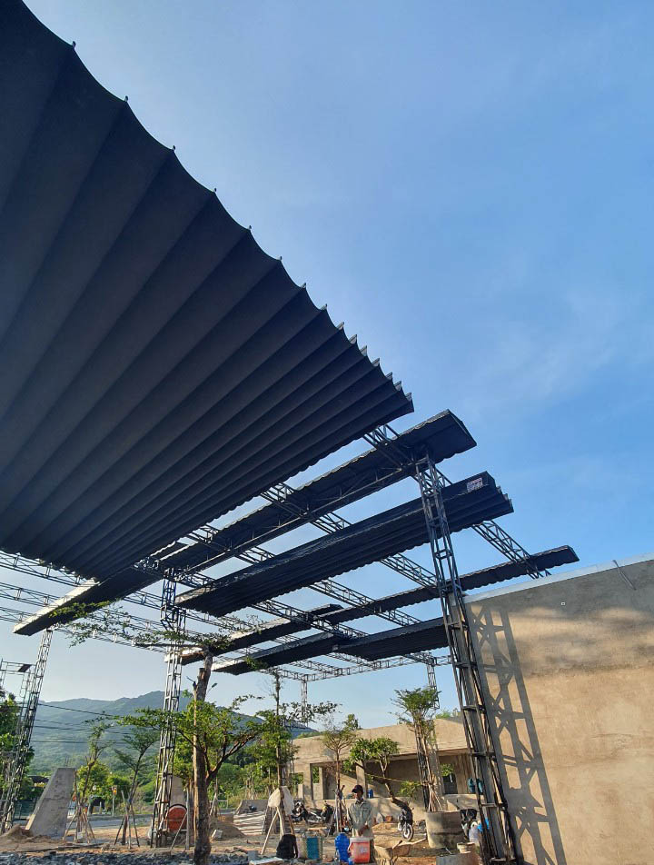 – Hệ thống mái kéo sắt 20 x 40m, dày 1,2 ly, thanh sắt hộp chịu tấm mái (bạt) kéo.