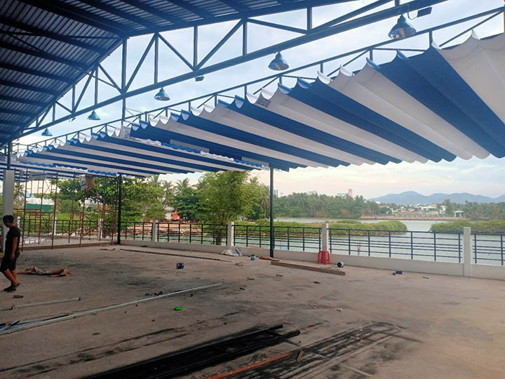 + Mái xếp di động lượn sóng cho nhà hàng, quán cafe, mái che sân vườn, mái che hồ bơi, sân trường, nhà để xe…